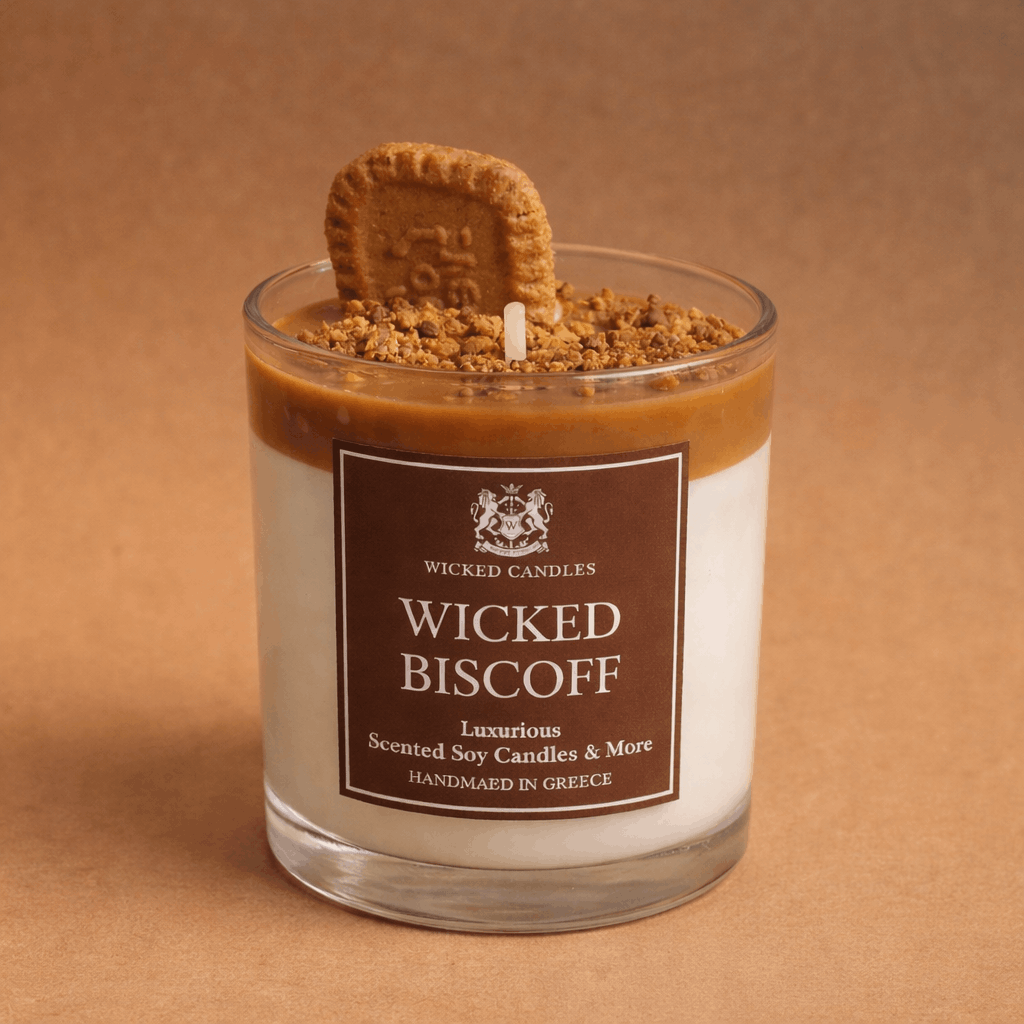Ανακάλυψε το Wicked Biscoff αρωματικό κερί σόγιας 300g, ένα χειροποίητο κερί που θυμίζει το αγαπημένο σου γλυκό.